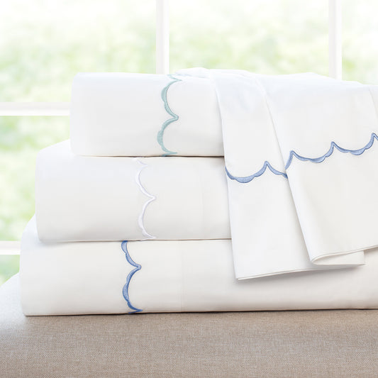 Coastal Blue Scalloped Embroidered Sheet Set (Fitted, Flat, & Pillow Cases)