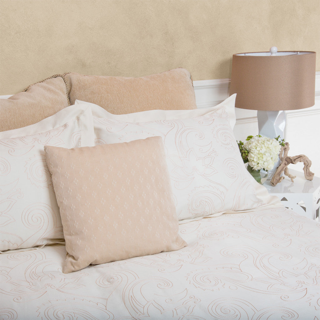 Crane & Canopy Dolores is a luxurious pearl white bedding that incorporates couture-inspired...