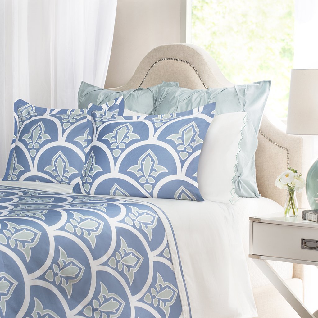 Your luxury bed awaits with the Clementina bedding, a modern take on the traditional scallop and fleur de lis pattern that will have you dreaming of coastal living. The Clementina blue and green bedding pairs beautifully with our Porcelain Green Sheets and the Valencia White Pintuck bedding.