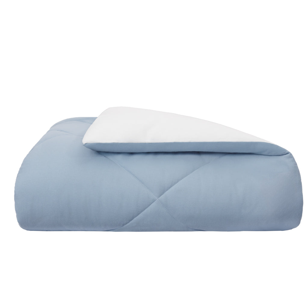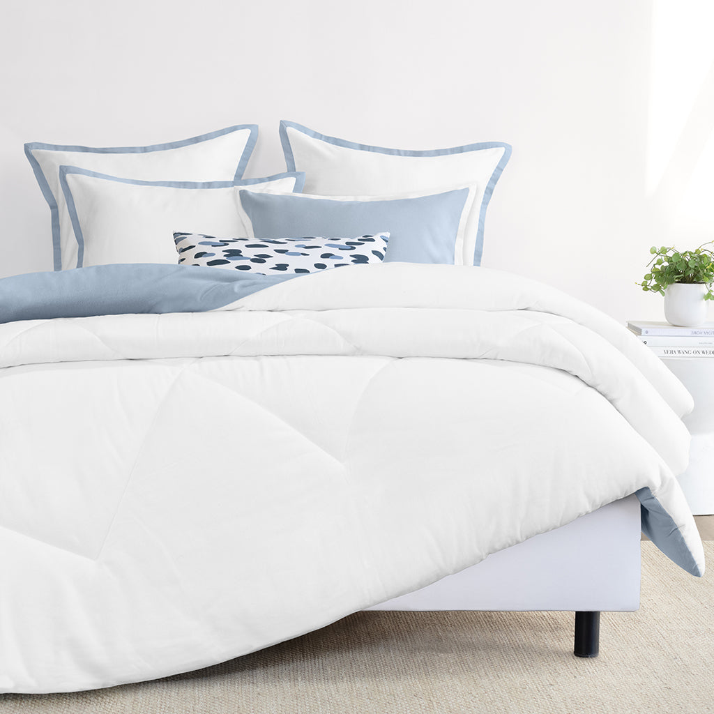 - A reversible comforter. A solid soft white side reverses to a solid french blue side for a versatile look every day. Love both sides? Give your bedding a fold up top for the look of a beautifully made bed.