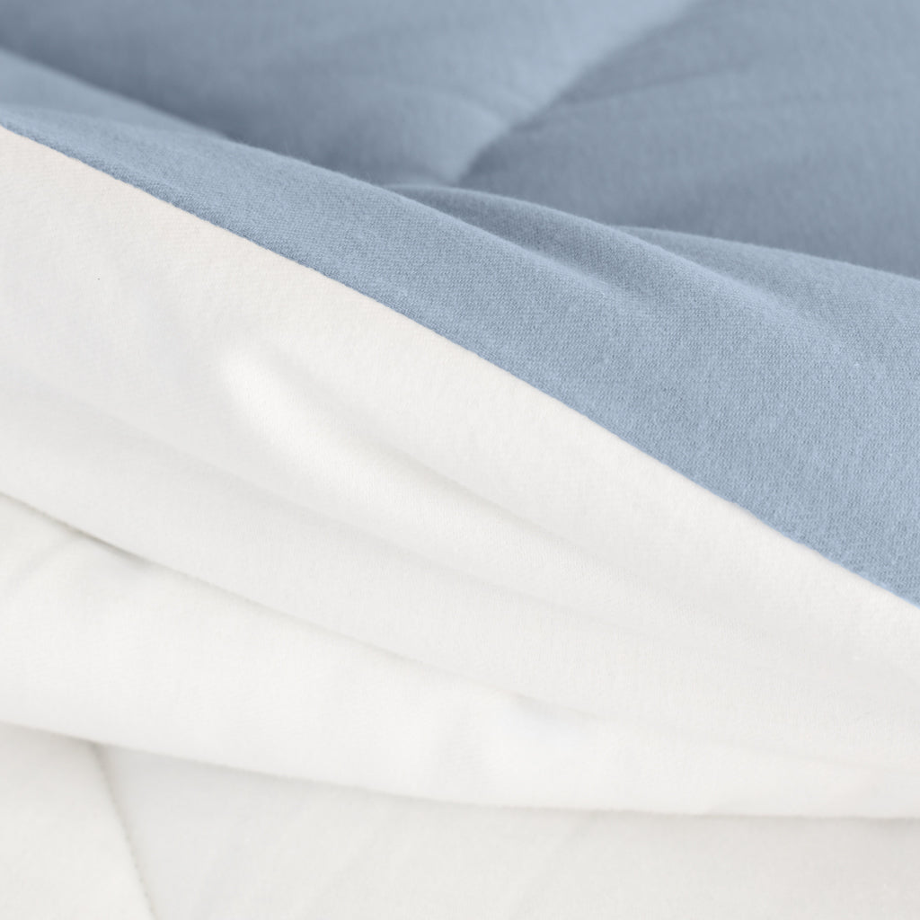 Color your cloud 9 with the coziest reversible flannel comforter. This luxurious solid soft white comforter reverses to a french blue side and provides superior comfort with the ultra soft warmth and feel of premium brushed flannel. The sewn through box-stitch construction allows for durability and comfort while keeping the fill and warmth evenly distributed for a blissful night's sleep. Our Soft White and French Blue Reversible Flannel Comforter pairs beautifully with our flannel bedding collection.