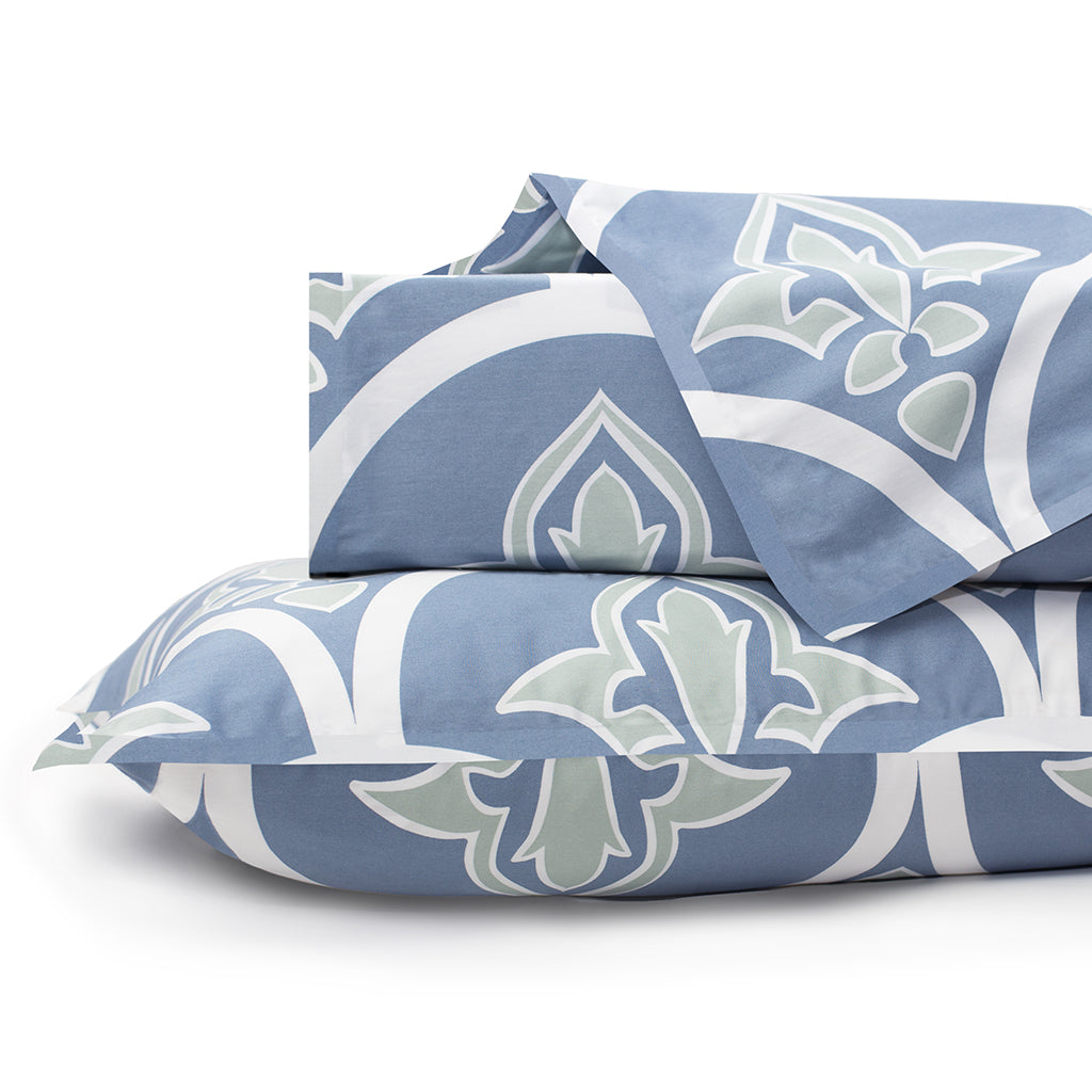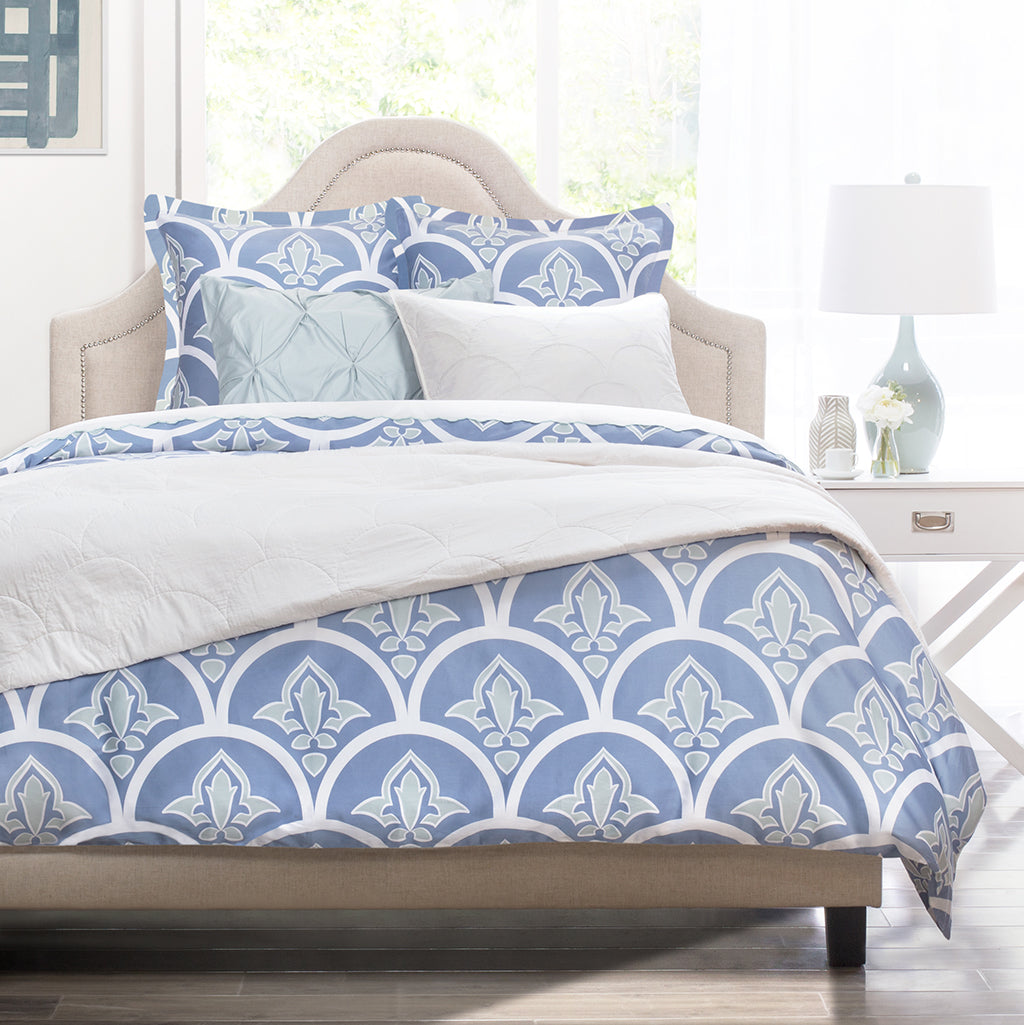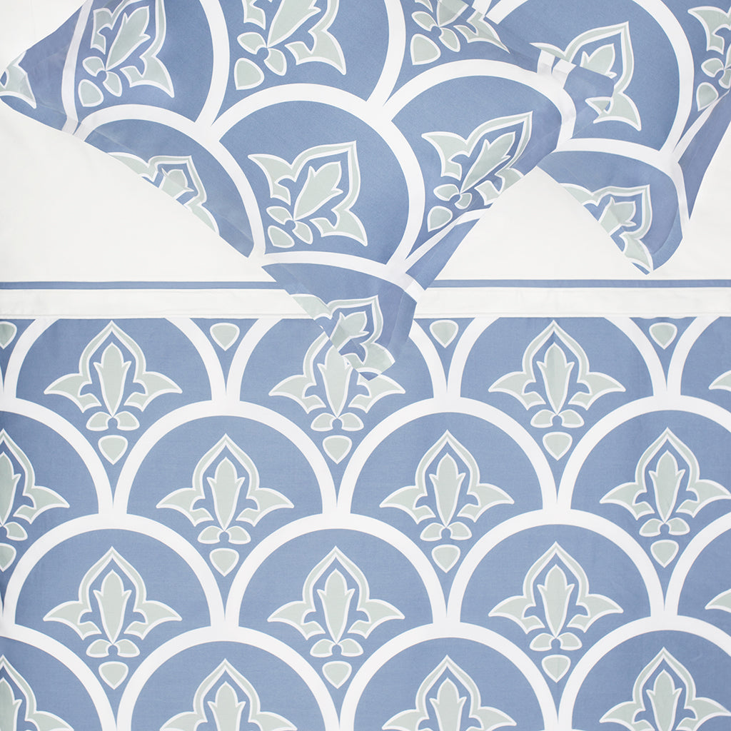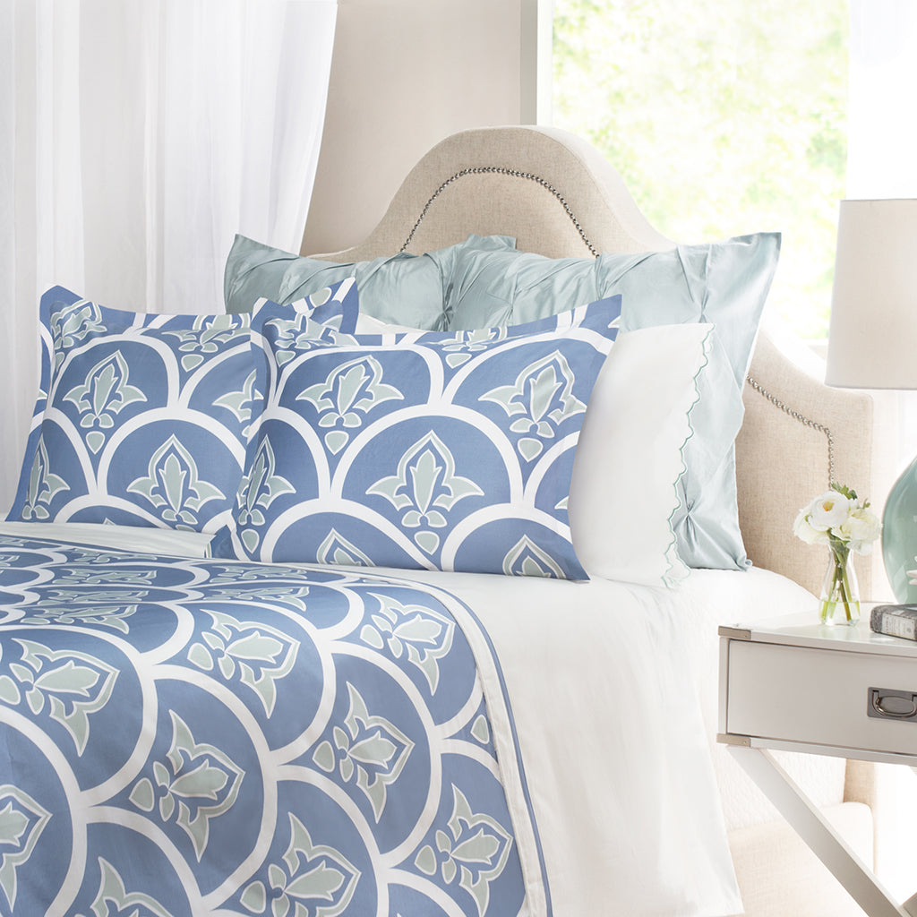 Your luxury bed awaits with the Clementina bedding, a modern take on the traditional scallop and fleur de lis pattern that will have you dreaming of coastal living. The Clementina blue and green bedding pairs beautifully with our Porcelain Green Sheets and the Valencia White Pintuck bedding.