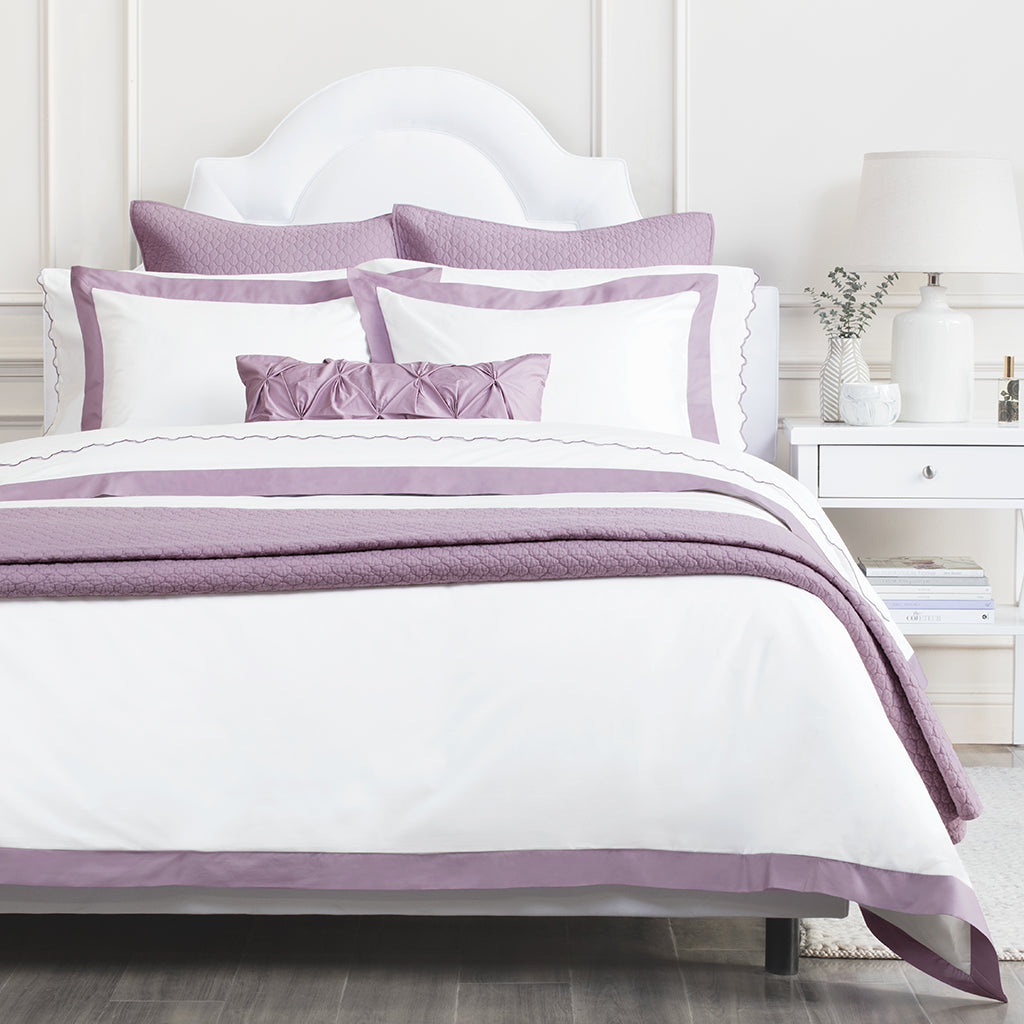 The luxury is in the details, especially when inspired by the classic bedding found in the finest luxury hotels around the world. Woven from luxurious 400-thread count, single ply, 100% cotton with tailored lilac purple borders, this irresistibly soft and beautiful white and light purple duvet cover lends elegance to any room.