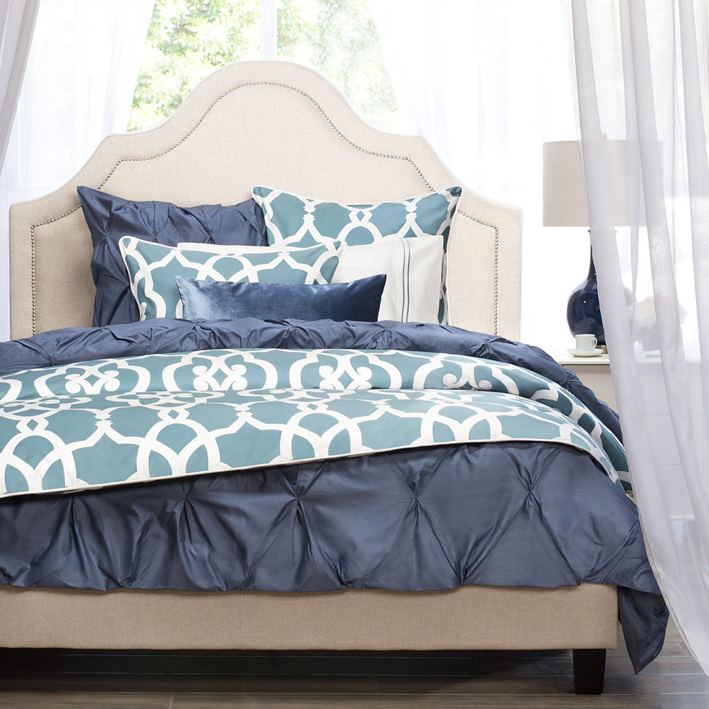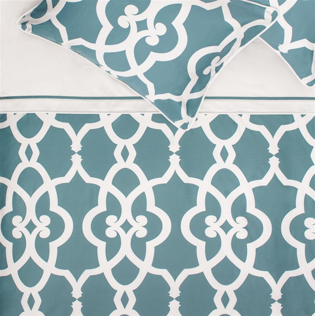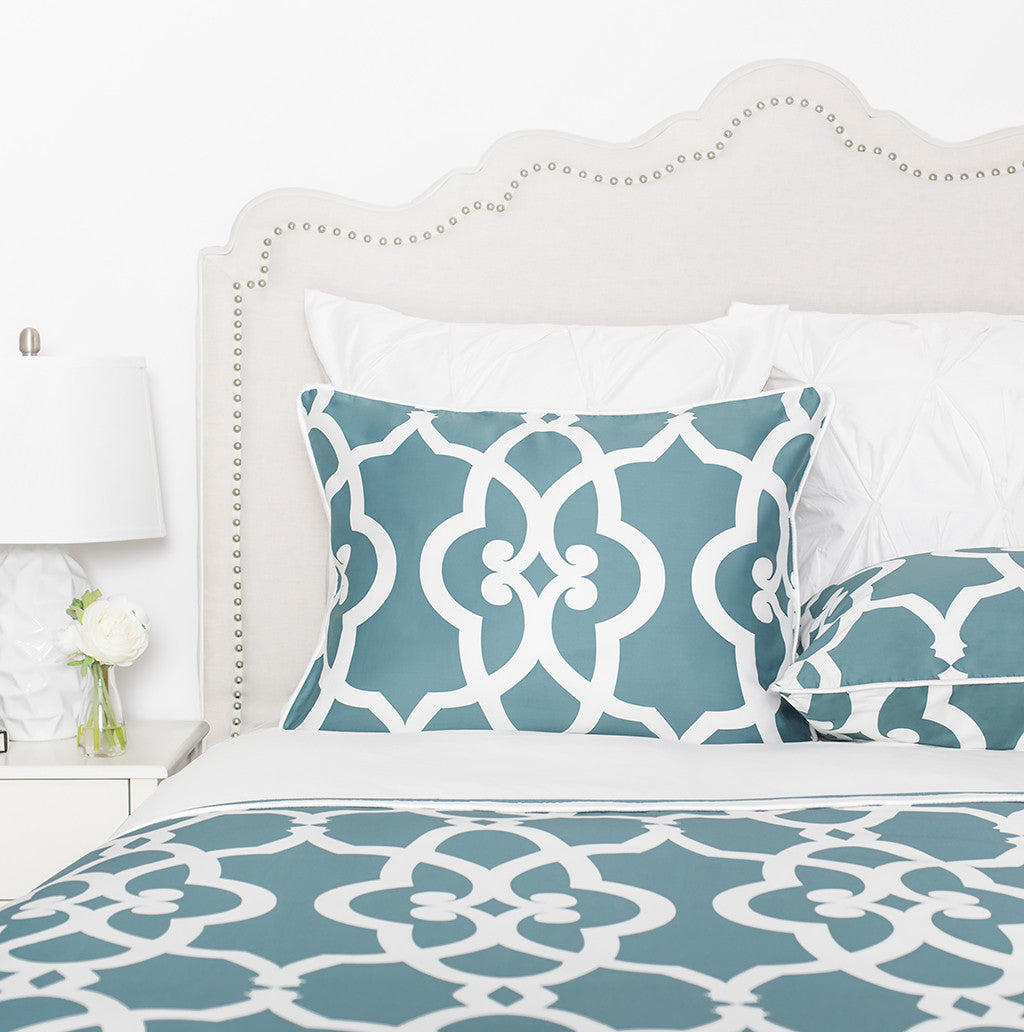 We love a large-scale geometric pattern with modern details. Our gorgeous Pacific Teal duvet cover, made from 100% long staple cotton and woven in a beautiful 300-thread-count, will make the perfect statement in your bedroom. Our Pacific Teal duvet cover pairs beautifully with our White Embroidered Sheets and the Valencia White Pintuck bedding set.