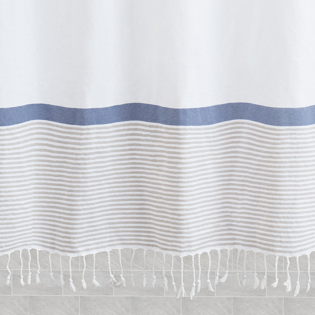 Make a bold statement in your bath with our beautifully printed shower curtains. With a classic stripe print and playful fringes, this blue and white shower curtain will instantly add a coastal vibe to your bathroom.