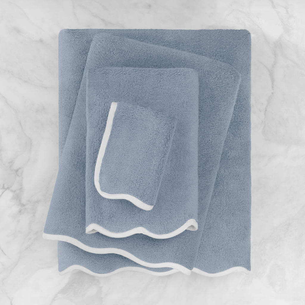 We've taken chic to a new level with our plush Vista Blue towels, featuring a beautifully white scalloped edge. Woven from premium long-staple Turkish cotton and spun with innovative air technology, our scalloped plush towels offer superior absorbency and an incredibly soft plush feel. Add a monogram to make it yours.