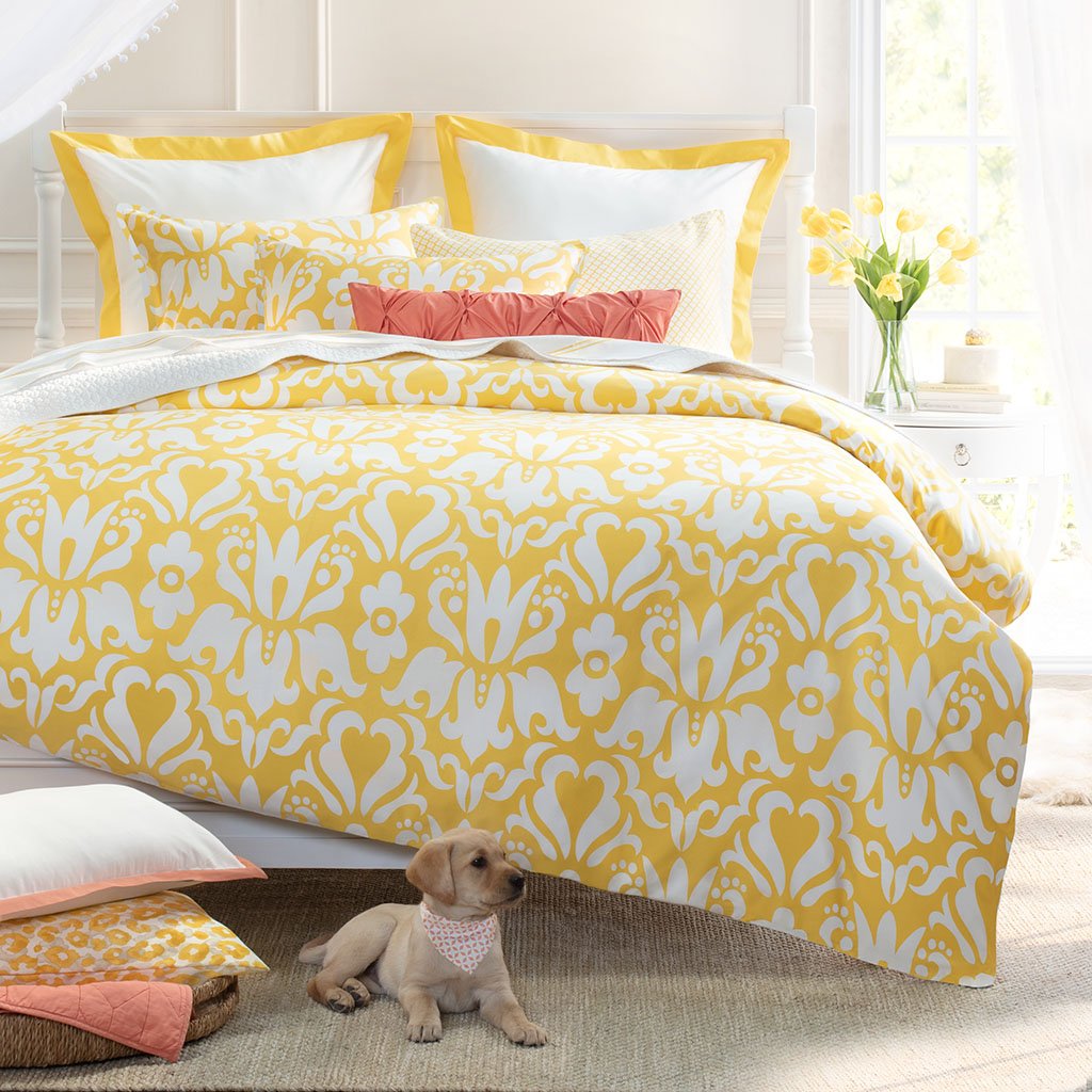 A pop of color, pattern play, and a luxurious fabric. With its modern take on the traditional damask pattern, the Montgomery Yellow damask duvet cover will instantly brighten any bedroom. Pairs beautifully with our Mirabel Ruched White Bedding Set.