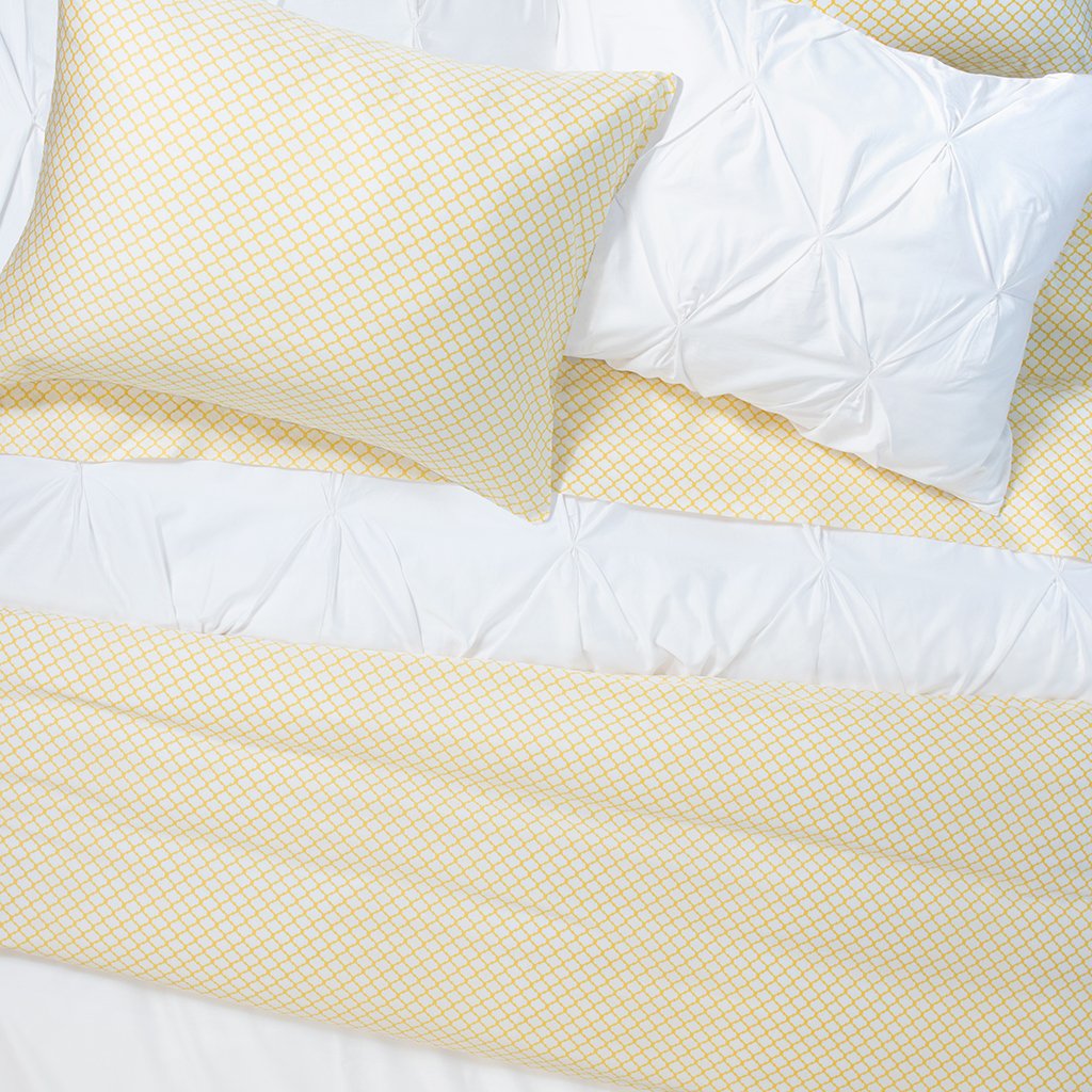 A modern take on the classic all-white bedding evident to the smallest detail. The Page Yellow duvet cover is our most versatile bedding yet with its luxurious white top that reverses to a beautiful small printed yellow cloud pattern. This yellow print bedding pairs beautifully with the Yellow Cloud Sheet Set and the Yellow Scalloped Sheet Set for an elegantly layered bed.